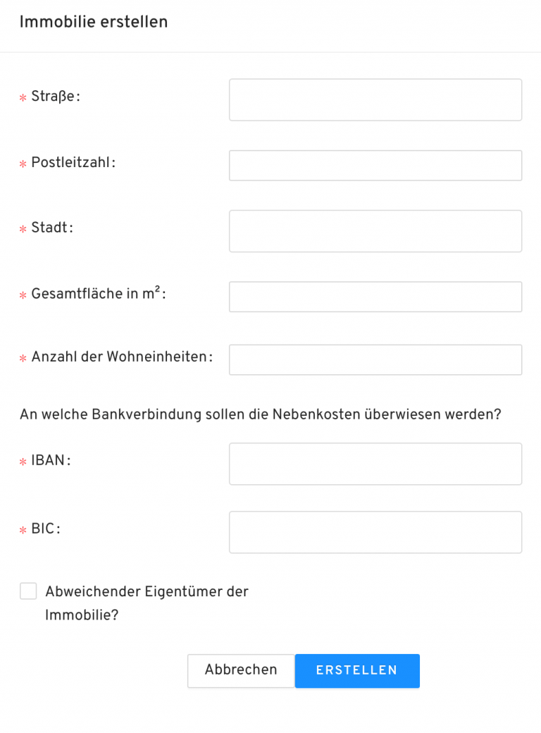 Für die Anlage Ihrer Immobilie geben Sie bitte alle Daten der zu verwaltenden Immobilie an. Handelt es sich bei Ihrer Immobilie um eine Eigentumswohnung ist als Gesamtfläche lediglich die Größe der Wohnung und Anzahl der Wohneinheiten 1 anzugeben. Sind Sie Eigentümer eines Mehrparteienhaus ist die Gesamtwohnfläche der kompletten Hauses sowie die Anzahl aller Wohnungen einzugeben. Bitte erfassen Sie die Bankverbindung, auf die der Mieter die Nebenkostenabrechnung überweisen soll. Erstellen Sie für den eigentlichen Immobilieneigentümer die Nebenkostenabrechnung (z. B. Steuerberater) setzen Sie bitte den Haken „Abweichender Eigentümer der Immobilie“.