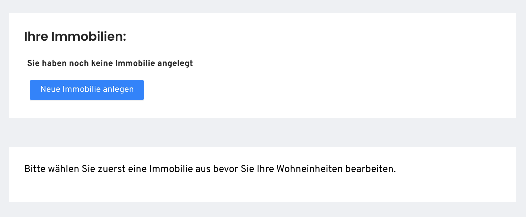 Über die Funktion „Neue Immobilie anlegen“ können Sie die Grunddaten Ihrer Immobilie (z. B. Adresse) erfassen und so mit der Immobilienverwaltung beginnen.