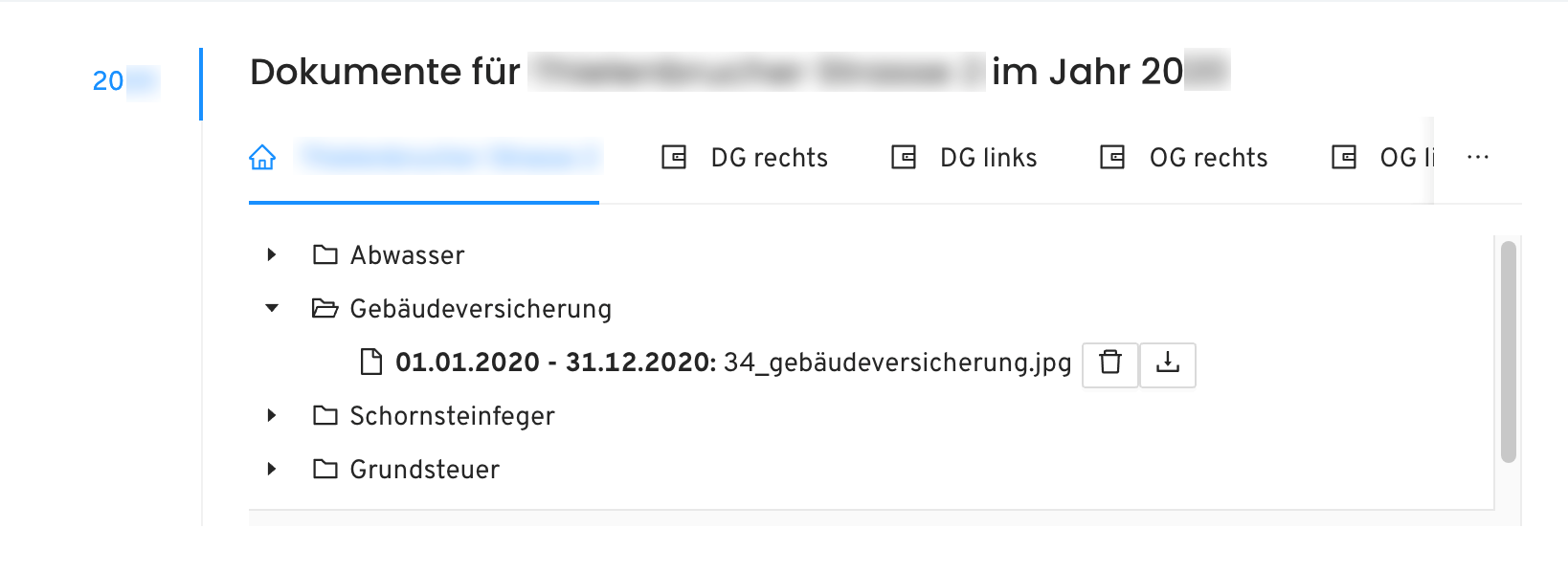 Die Ordnerstruktur der Dokumentenverwaltung ist nach den Nebenkostenarten aufgebaut. Hier können Dokumente hochgeladen und der entsprechenden Immobilie oder Wohnung zu geordnet werden. Bestehende Dokumente können gelöscht oder gedownloadet werden.